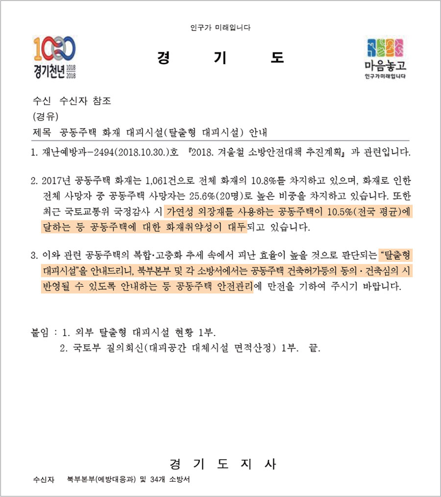 | 경기도 | 도내 31개 지자체, 경기도시공사 및 관할 34개 소방서에 탈출형대피시설 소개 및 권고 공문 발송(18.11) |