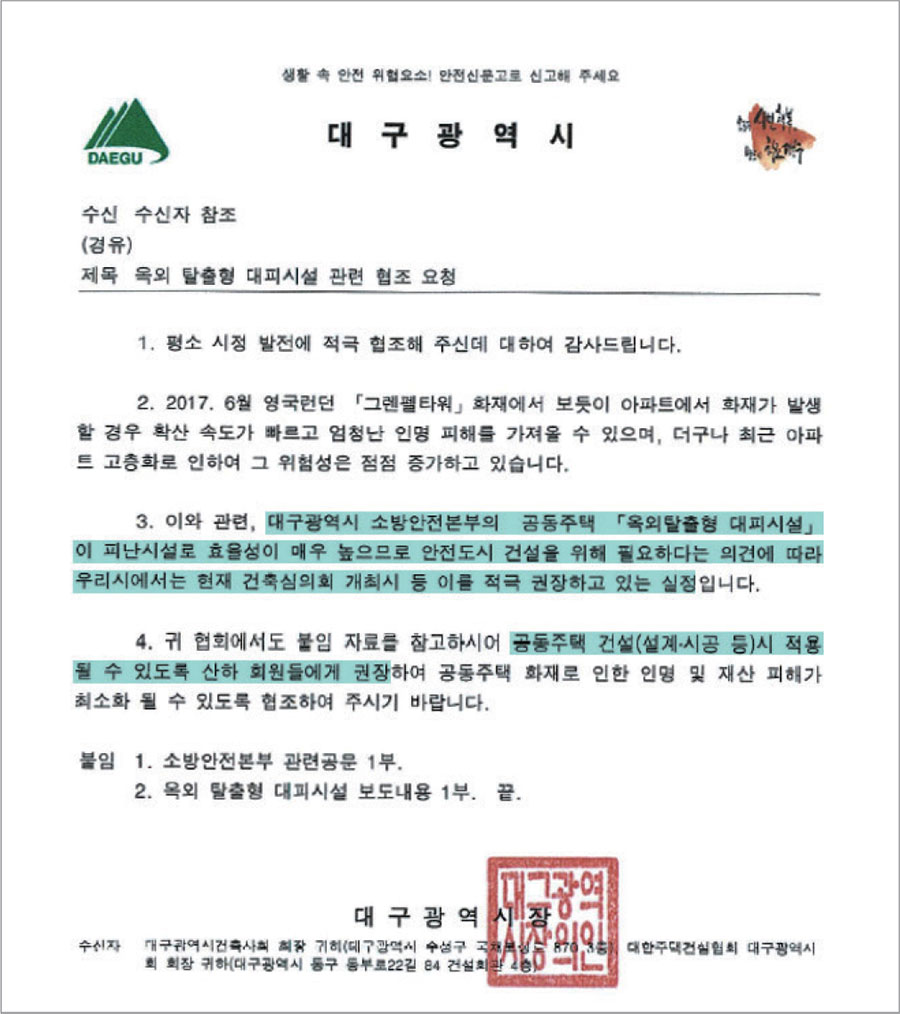 | 대구광역시 | 2017년 6월 그렌펠타워 참사를 계기로 고층아파트에 대한 건축 심의 시 탈출형대피시설 설치를 적극 권장 (17.08) |