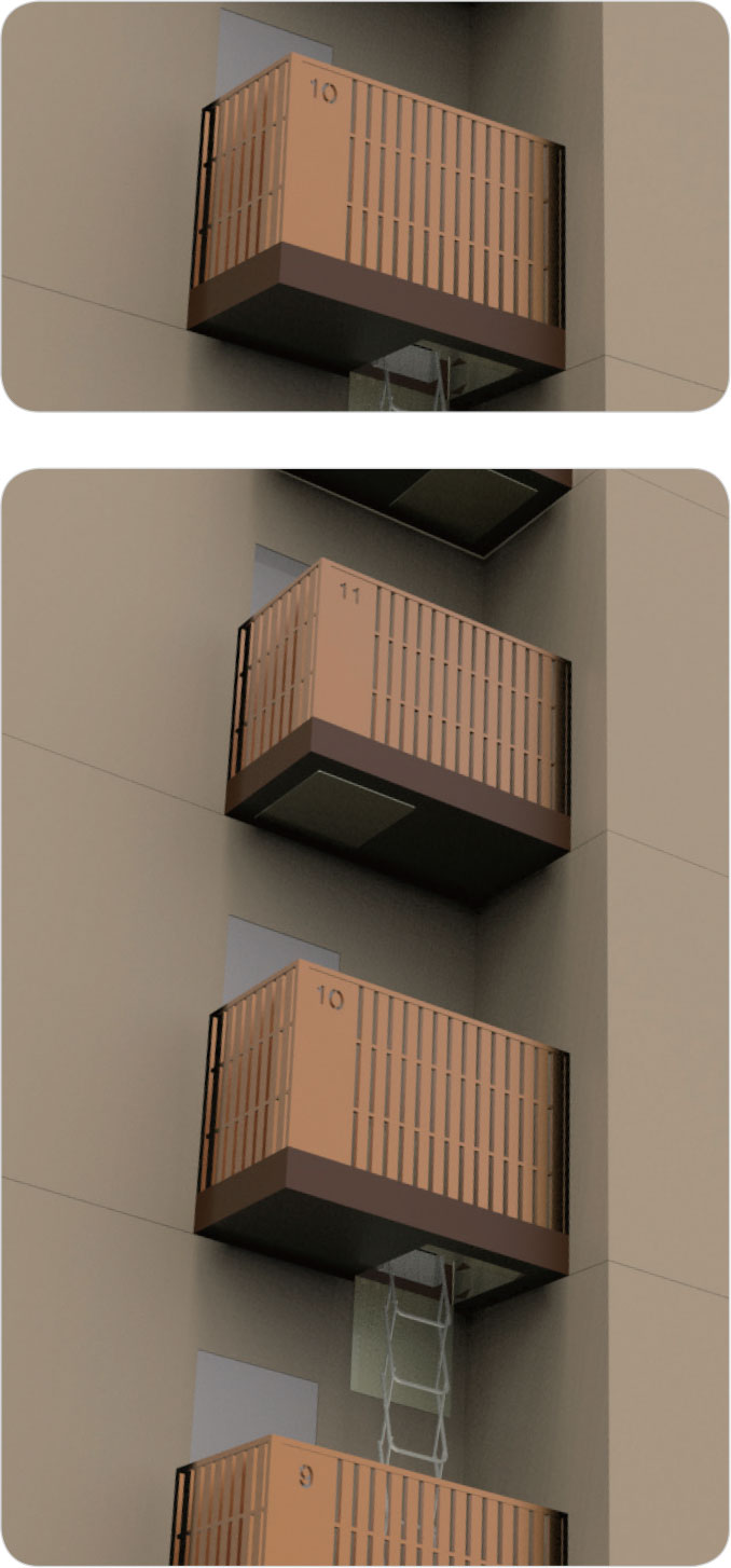 | 부산광역시, 충청남도 | 발코니에 대피공간을 설치하는 경우 소방법 규정에 맞춰 대피공간 내에 하향식피난구를 추가 설치하도록 권고 |